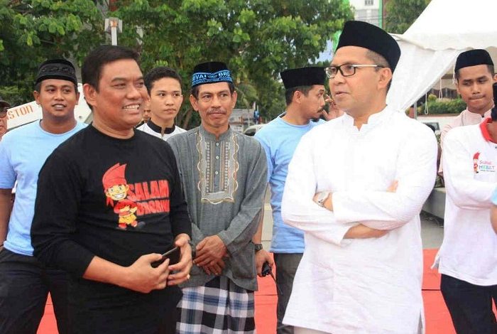 Bakal Calon Gubernur Sulsel, DR Ir H Abdul Rivai Ras MM MS MSi (Bro Rivai) berpapasan dengan Walikota Makassar Danny Pomanto saat berjalan-jalan menikmati suasana pagi di Anjungan Pantai Losari, Minggu (28/5/2017). Keduanya pun terlibat perbincangan dan saling memuji.